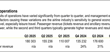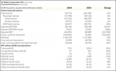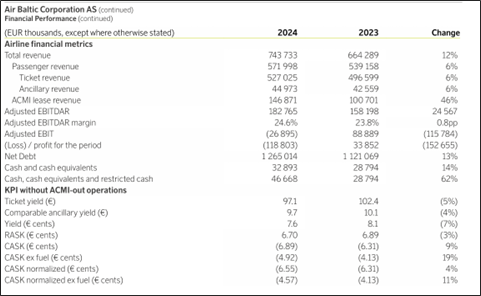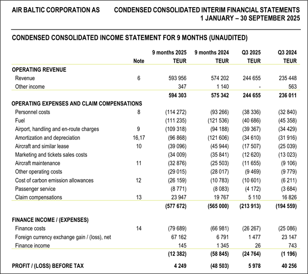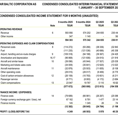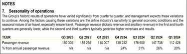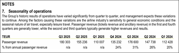 Did this improve summer earnings in 2025 for airBaltic? Not exactly, revenue largely unchanged on 9M basis year-on-year. The profit before tax does appear almost EUR 53 mn better than 9M 2024 but the main driver is a 67 mn FX gain in the 9M 2025 period. The operating revenue, expenses and claim compensations were largely similar year-on-year and were not the main drivers for the period delta in the before tax result. (consolidated financials 9M 2025) Additionally, the seasonality of each quarter shows that the 2nd and 3rd quarters of 2025 and 2024 are mostly similar in passenger revenue (p.31).