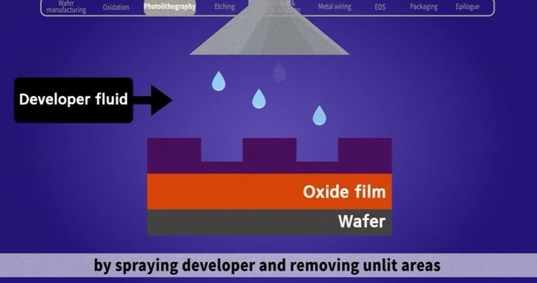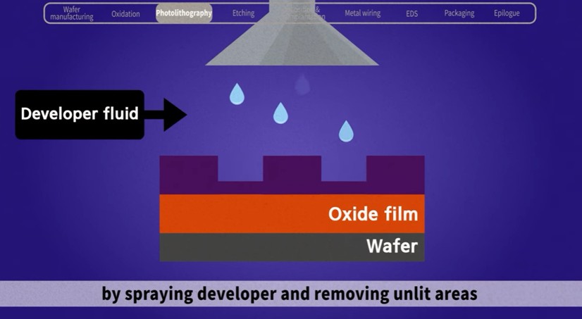 A circuit pattern is imprinted on the wafer by a developer fluid and removing unlit areas from the areas that are exposed to light.