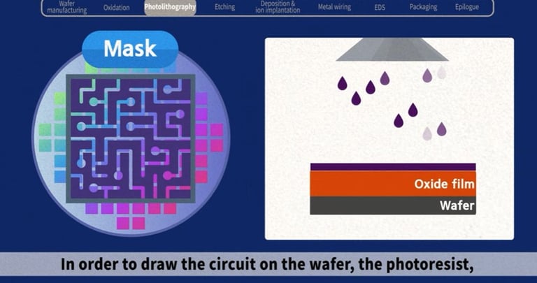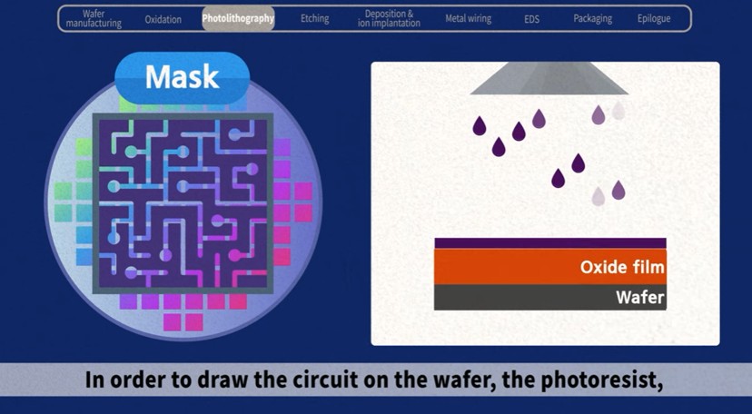 In order to draw the circuit on the wafer, the photoresist, a material that responds to light is applied thinly and evenly on the oxide film previously placed on the wafer :