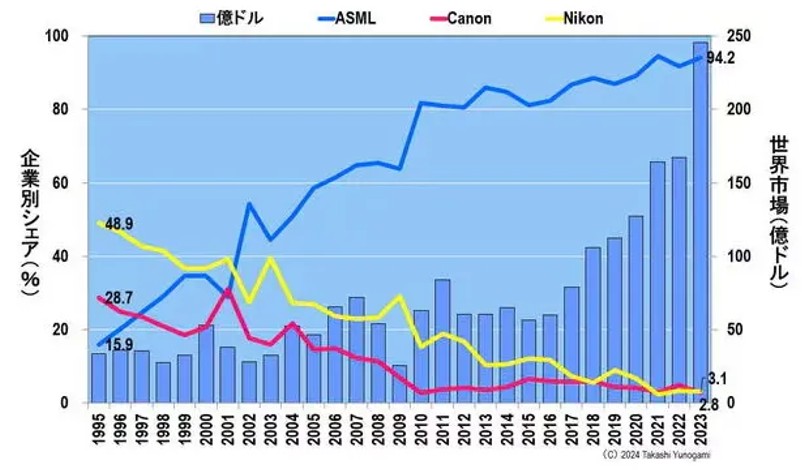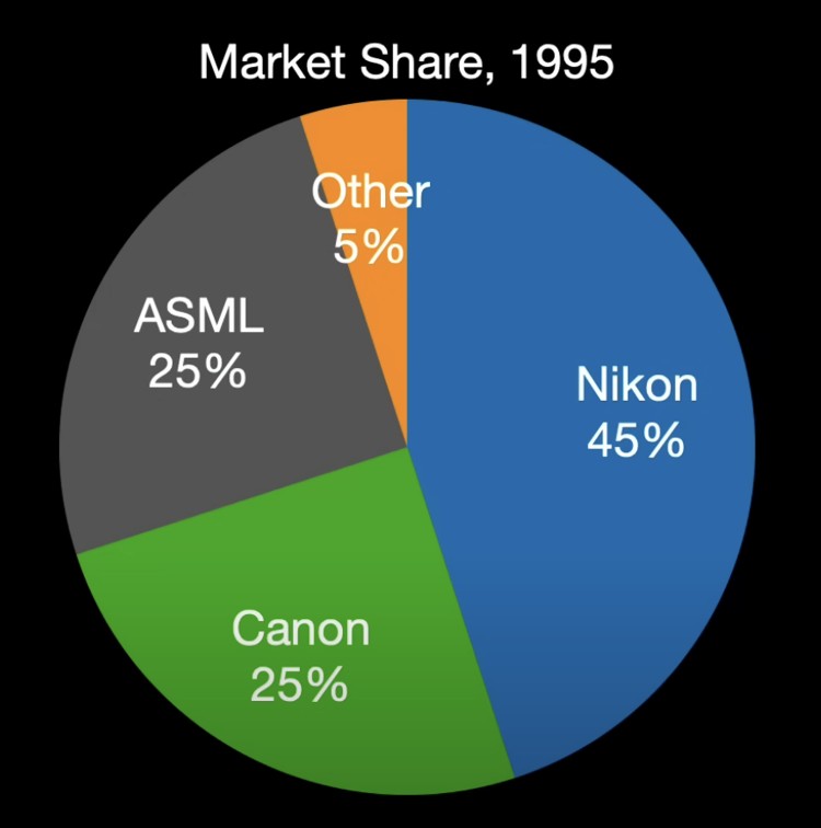 By the mid-1990s, an oligopoly formed between Canon, Nikon, and ASML, with other players either leaving the market or being absorbed.