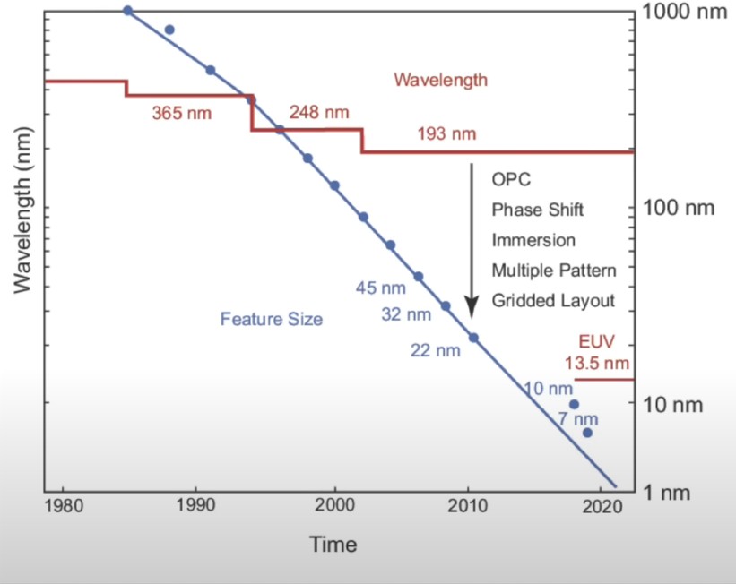 During the 1980s and 1990s, advances in lithography transformed the industry. It became easier to reduce transistor size by decreasing the wavelength of light.