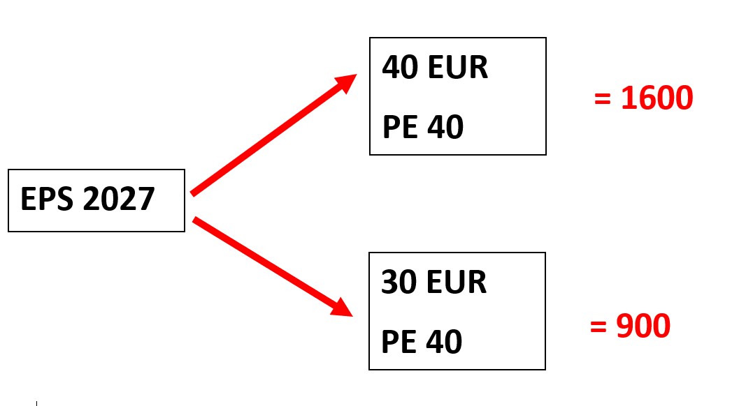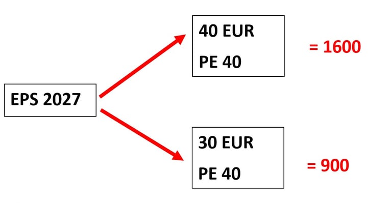 For example, let's take the 36 EUR EPS estimate for 2027, if the growth is just a bit slower than expected, and the EPS is 30 EUR, where the market applies a 30 PE ratio to it, ASML's stock price in 2027 could be 900 EUR. However, if the growth is better than consensus, let's say EPS of 40 EUR, with a PE ratio of 40, the stock price can go to 1600 EUR. Whether EPS will be 30 or 40 will depend on many factors, from the economy, the rate of growth in the industry in 2027 etc.