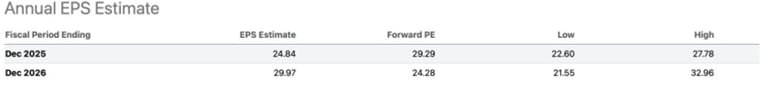 If we take Wall Street's estimates, the range for 2026 EPS is between 21.55 EUR and 32.96 EUR.