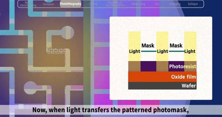 Now, when light transfers the pattern photo mask the circuit is drawn on the wafer surface, just like developing a photo.