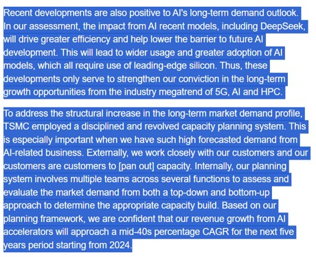 That seems like a bold claim and prediction 40% CAGR for the next 5 years, it’s great and amazing for ASML if it happens. But I don’t need it to necessarily be true. As long as TSMC act on that plan and expand their capacities and thus buy more of ASML’s lithography machine. Though we should keep in mind it could mean that there could be an overcapacity at some point if the demand for AI slows at some point.